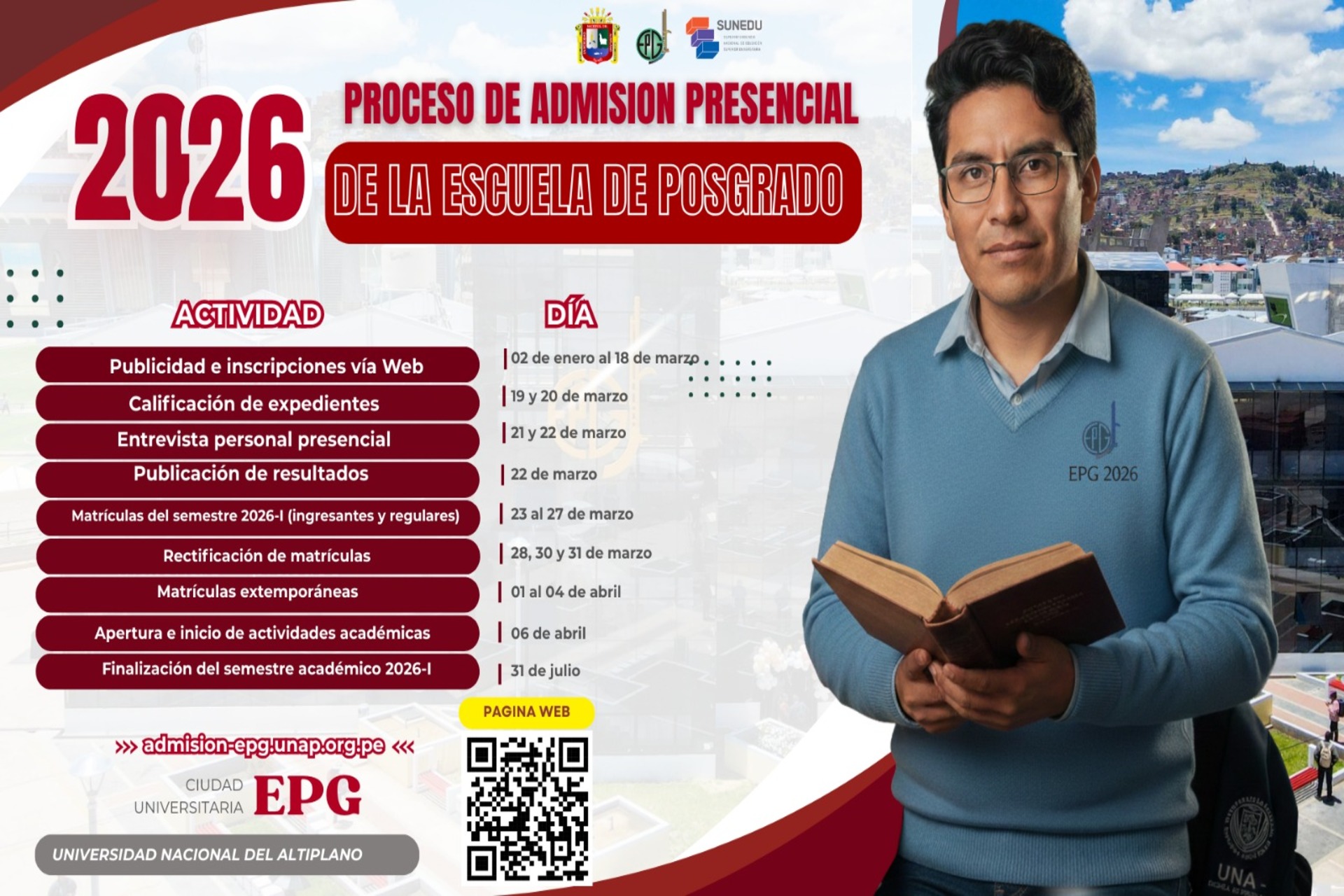 admision Posted by admin Date 19 enero, 2026 Share: admin You may also like Proceso de Admisión 2026 18 enero, 2026 Feliz Año Nuevo 2026: Compromiso y Logros en la Escuela de Posgrado UNA-Puno 31 diciembre, 2024 II FORO DE DIVULGACIÓN CIENTÍFICA – Edición 2025 22 noviembre, 2024